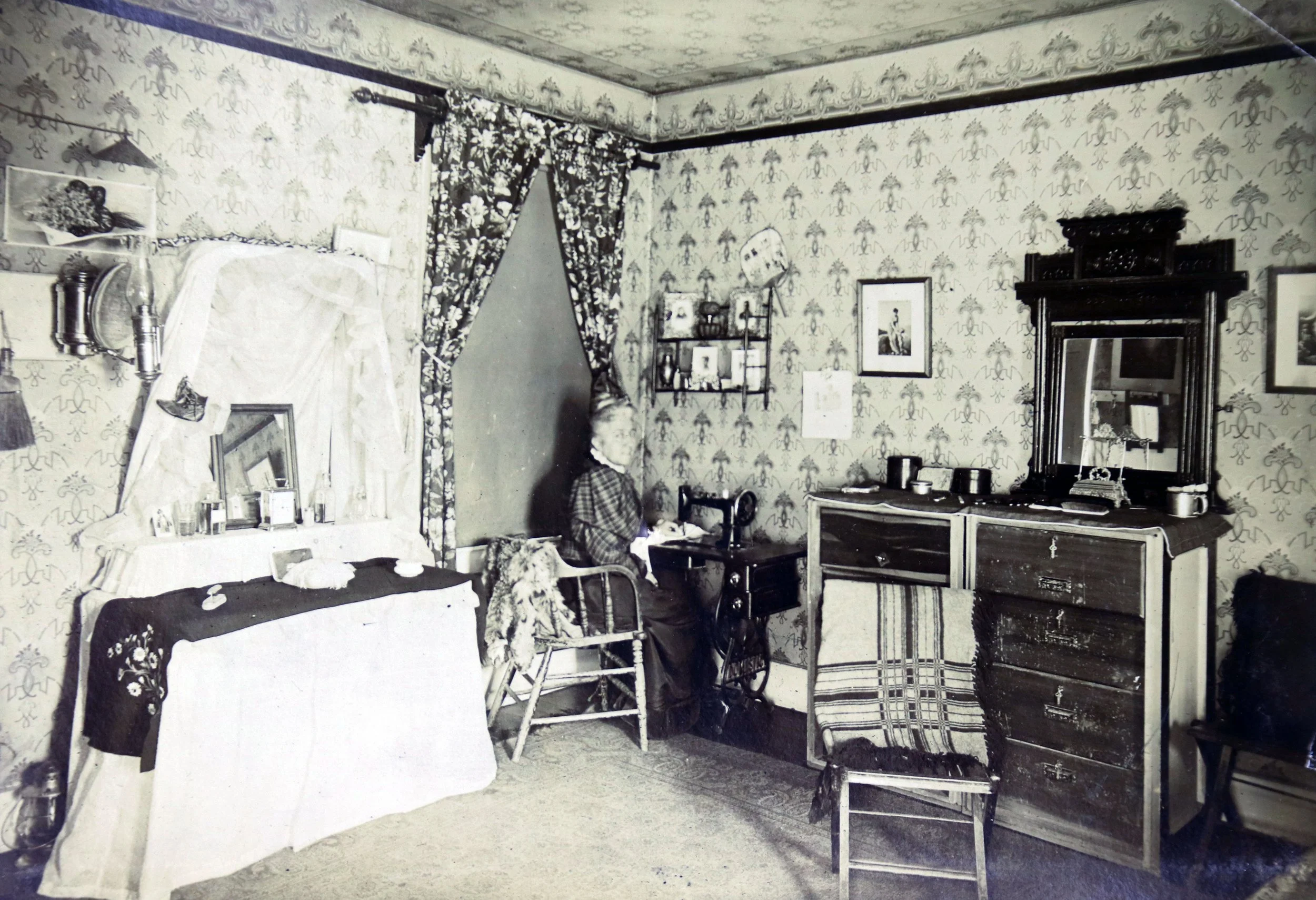 Kate Mifflin Loud in the bedroom in the Loud’s quarters. 1895-7. Ft. Washakie, Wyoming. Photo from Loud family scrapbook.